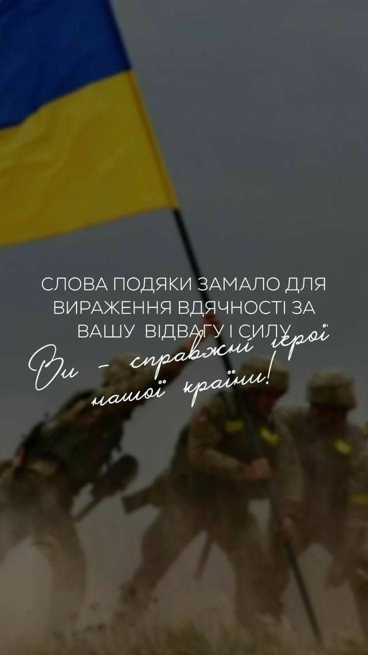 Зізнатися чесно, ми все ще не знаємо, як правильно дякувати військовослужбовцям і військовослужбовицям, адже всі слова здаються малими і невідповідними. Тому, скажемо по-простому — дорогі Захисники й Захисниці — ми вітаємо вас і доземно вклоняємося вашому подвигу. Ми пишаємось тим, що благодатна українська земля в усі віки народжувала хоробрих і славетних воїнів-Захисників, але не загарбників. Ми, досі живі, й усі майбутні покоління, в неоплатному боргу перед вами, бо ви віддаєте найдорожче — сили, час, життя, здоров’я. Тому ми просто повинні бути гідні вас і, обіцяємо, що докладемо зусиль для цього. Дякуємо кожному воїну за щоденний захист. Ви творці нашого майбутнього. Ви супергерої для всього світу, бо тримаєте значно більше, ніж свою лінію оборони, – українське небо і українську долю.