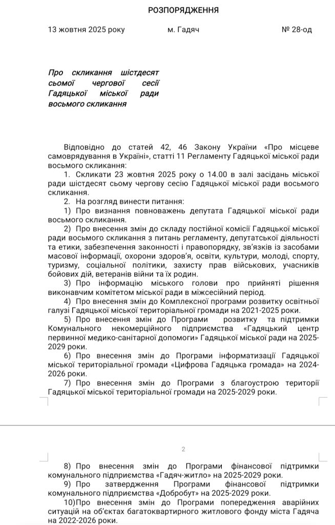 Події ТОП новини У Гадячі скликають чергову сесію міськради 3 години тому Bazarmedia Поділитися новиною Розпорядження міського голови “Про скликання шістдесят сьомої чергової сесії Гадяцької міської ради восьмого скликання” оприлюднили на сайті громади 13 жовтня.У порядку денному : Перегляди: 88 Tags: гадяцька міська рада, Гадяччина, Полтавщина, Сесія, Україна Continue Reading Previous Уряд змінив дати опалювального сезону More Stories Події ТОП новини Уряд змінив дати опалювального сезону 11 години тому Bazarmedia Культура ТОП новини У видавництві “Гадяч” вийшов 18 випуск часопису «Мистецьке гроно» 12 години тому Bazarmedia Події ТОП новини На Гадяччині стартував І етап Всеукраїнських учнівських олімпіад 12 години тому Bazarmedia Залишити відповідь Скасувати відповідьВаша e-mail адреса не оприлюднюватиметься. Обов’язкові поля позначені *Коментар * Ім'я * Email * Сайт Зберегти моє ім'я, e-mail, та адресу сайту в цьому браузері для моїх подальших коментарів.