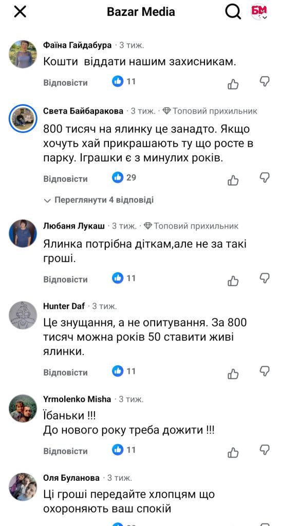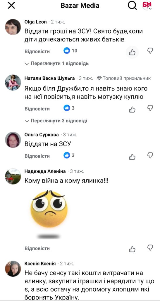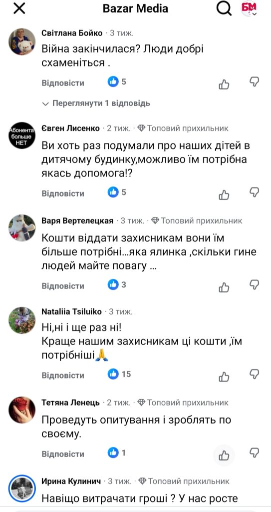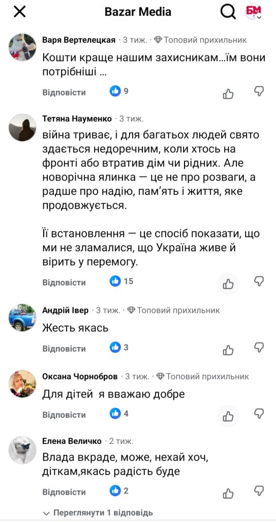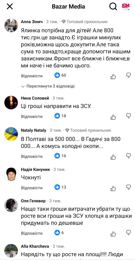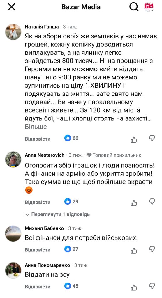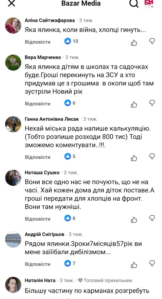 Проте, найімовірніше через осуд громади, витрати вирішили зменшити. На придбанння штучної ялинки, а також гірлянд для неї, різдвяної верхівки, антивандальної огорожі, на оплати послуг з їхньої доставки виділили 240 тисяч гривень на вчорашній сесії міської ради.