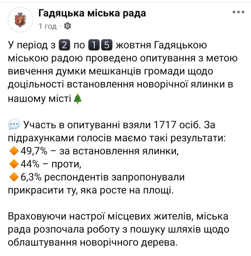 Нагадаємо, Гадяцька міська рада поцікавилась думки мешканців міста стосовно доцільності встановлення новорічної ялинки.