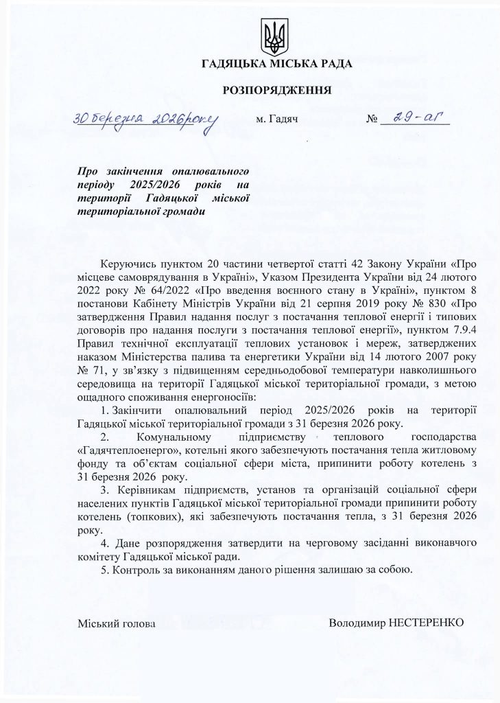 Відповідно до розпорядження міського голови “Про закінчення опалювального періоду 2025/2026 років на території Гадяцької міської територіальної громади” у зв’язку з підвищенням середньодобової температури опалювальний сезон у громаді завершиться 31 березня.